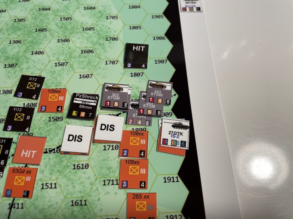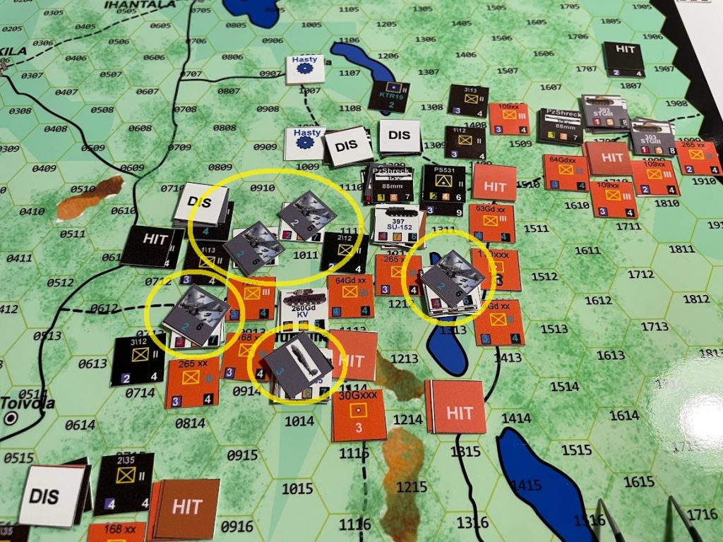 Most of the map is forested, which restricts movement. There is randomness in both artillery and air support availability, as well as in combat results. Heavy IS-2 tanks and SU-152 assault guns are formidable Soviet assets. The Finns receive Panzerschrecks and StuG III assault guns as reinforcements. Even the tiny T-26 tanks and BT-42 assault guns are useful—they’re fast and project a Zone of Control. Panzerschreck teams can also be repositioned to stop or delay breakthroughs.