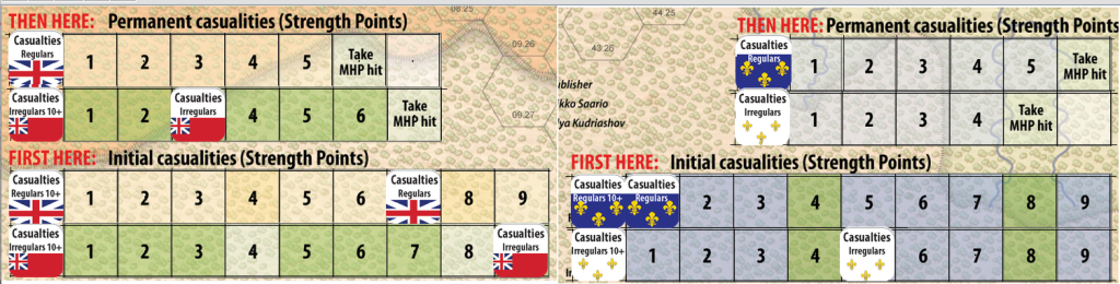 In the image above, the British regulars have suffered a total of 7 SP of initial losses. Losses are always reduced in groups of four: three SP are transferred to Permanent Losses, and one SP is returned as a replacement.