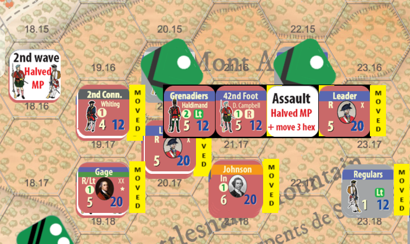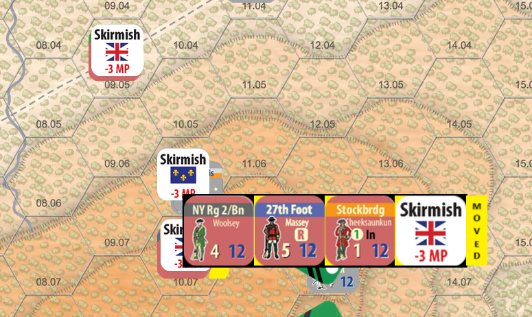 A small French Indian unit, which had previously failed to achieve success against shaken British forces, was able to regroup. Instead of withdrawing off the map (which would not incur a penalty), it force-marched through the morning mist across the hills toward the British landing area, hoping to surprise lightly protected artillery and supply units. However, on their own turn, Provincial troops moved into position and secured the area before the French could reach their target.